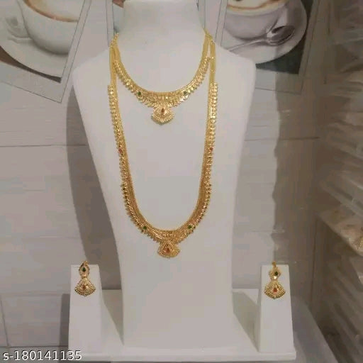 झिलमिलाती शान: चमकदार पत्थरों से जड़ा सोने का पानी चढ़ा महिलाओं का हार और झुमके का सेट