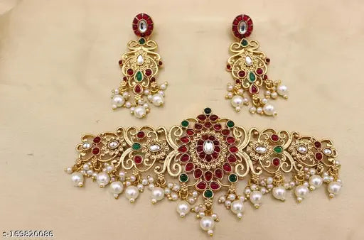 ट्विंकलिंग फ्यूज़न गोल्ड-प्लेटेड ज्वेलरी सेट विद पर्ल्स - एडजस्टेबल चोकर और इयररिंग्स