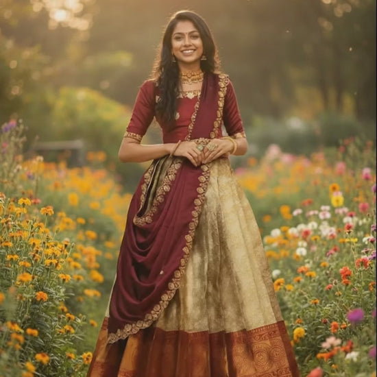 Beautiful Semistitch Half Saree for Women with Woven Design & Rangoli Embroidery Dupatta#
