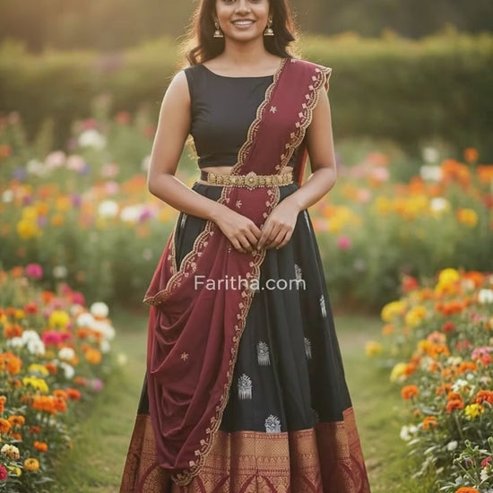 South Indian Litchi Silk Half Saree with Embroidered Blouse & Rangoli Dupatta #