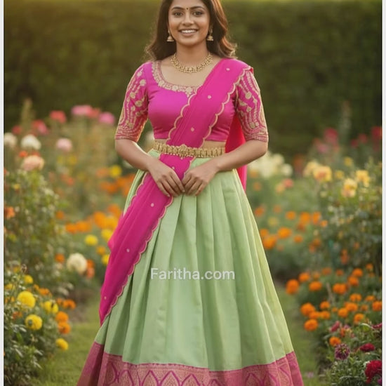 Trending Beautiful South Indian Style Half Saree With Blouse & Rangoli Embroidery Dupatta