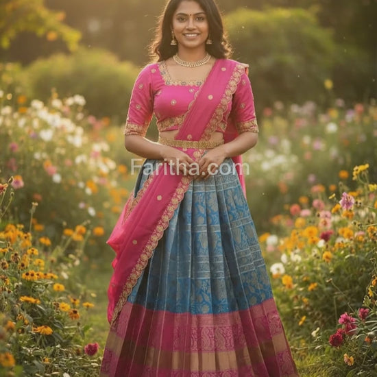 Trending South Indian Unstitched Half Saree Set with Blouse & Rangoli Embroidery Dupatta#