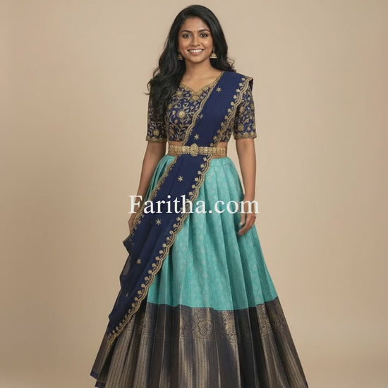 Beautiful Woven Lichi Silk Half Saree with Embroidered Blouse & Rangoli Dupatta #